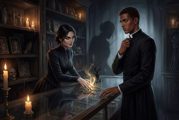 Luci FerBright watched him enter the shop, dressed all in black. The priest pulled at his starched white collar. The tightness across his throat causing obvious discomfort. There was a subtle unease about the man. She could almost hear his love-sick heart beating rapidly against his rib cage. “You should be used to that collar by now father.”